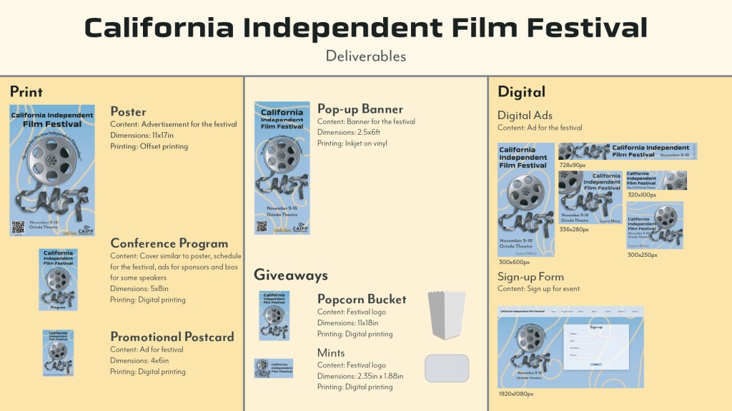 I conducted research into other similar events. In this process I looked at how the California Independent Film Festival stands out from its competitors and what weaknesses it has. Additionally I looked at who the target audience is for this event. For this I created three personas. My primary, secondary and tertiary audience.