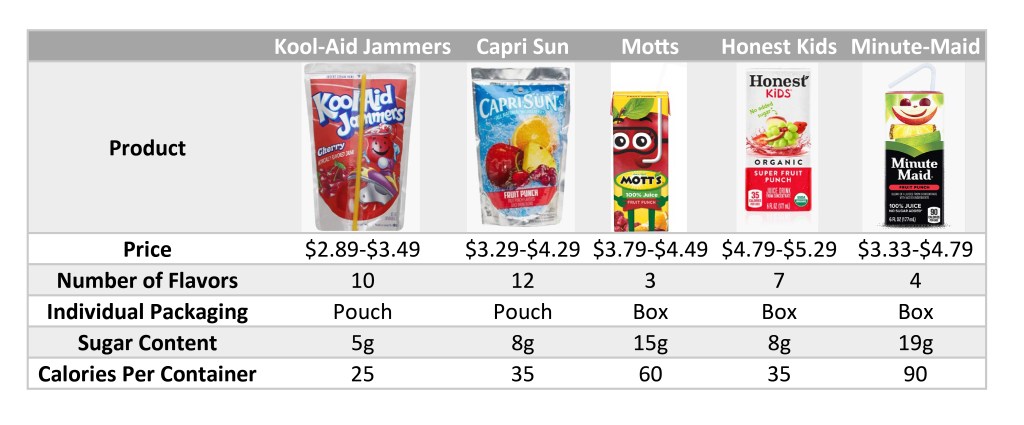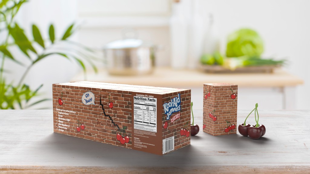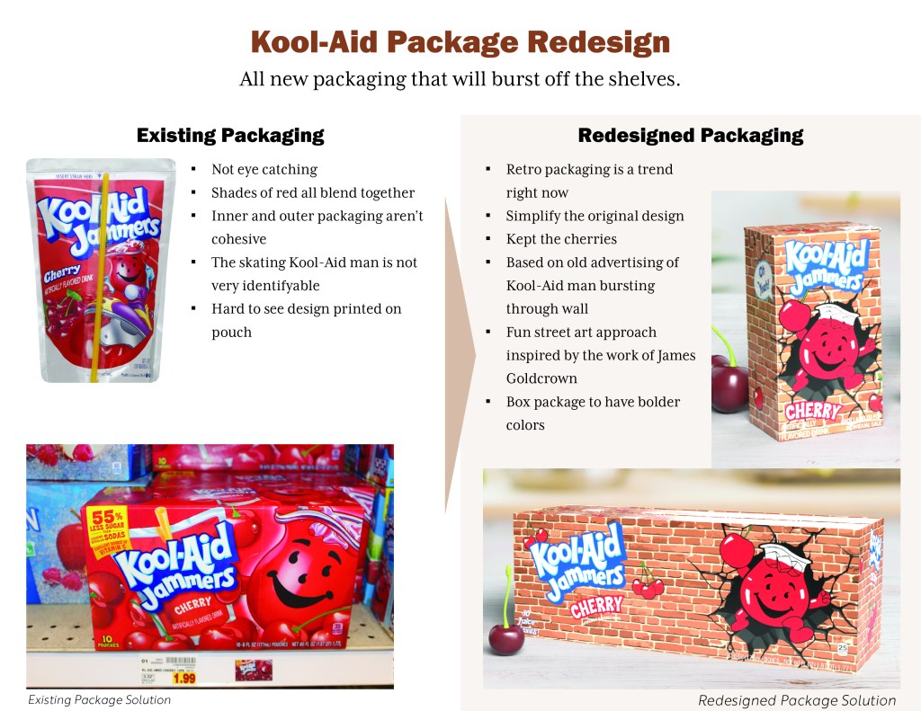 I chose Kool-Aid Jammers because it is a popular beverage for children’s lunches and the existing packaging doesn’t stand out on the shelf.